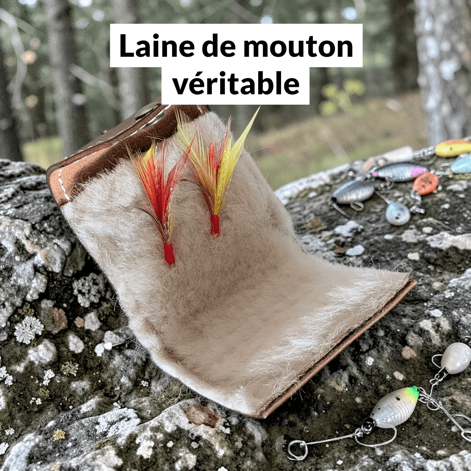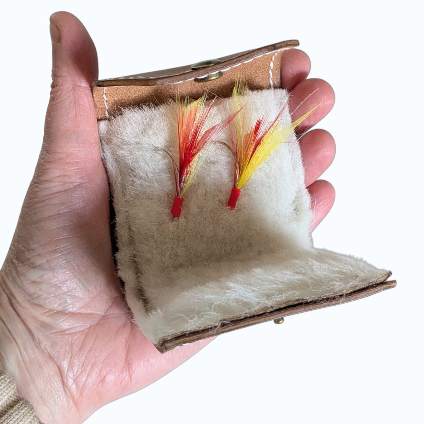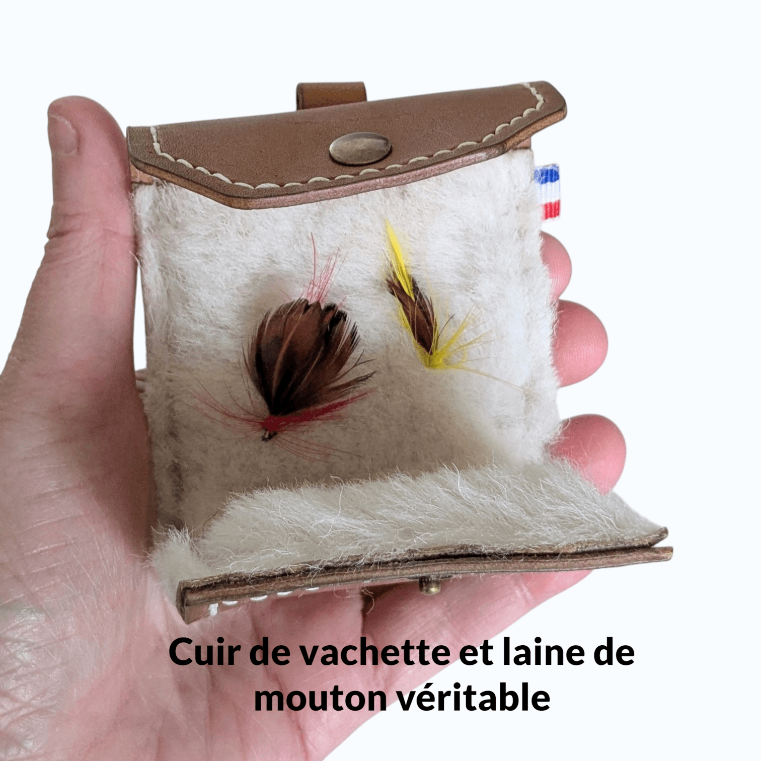 Étui en cuir véritable pour mouches de pêche – Fait main, avec laine de mouton – Personnalisable
