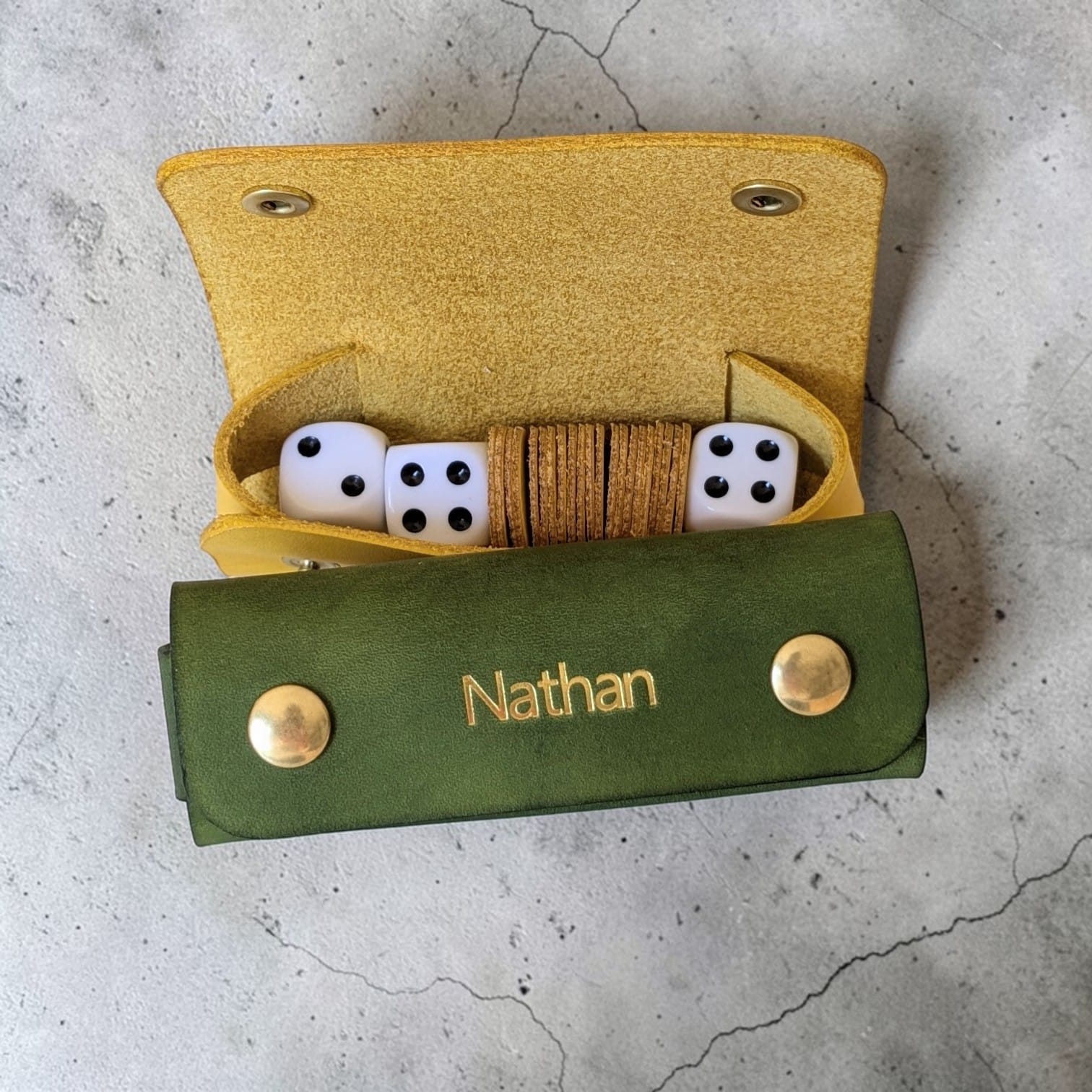 Jeu 421 dans un étui en cuir. Fait-main et personnalisé, gravure prénom