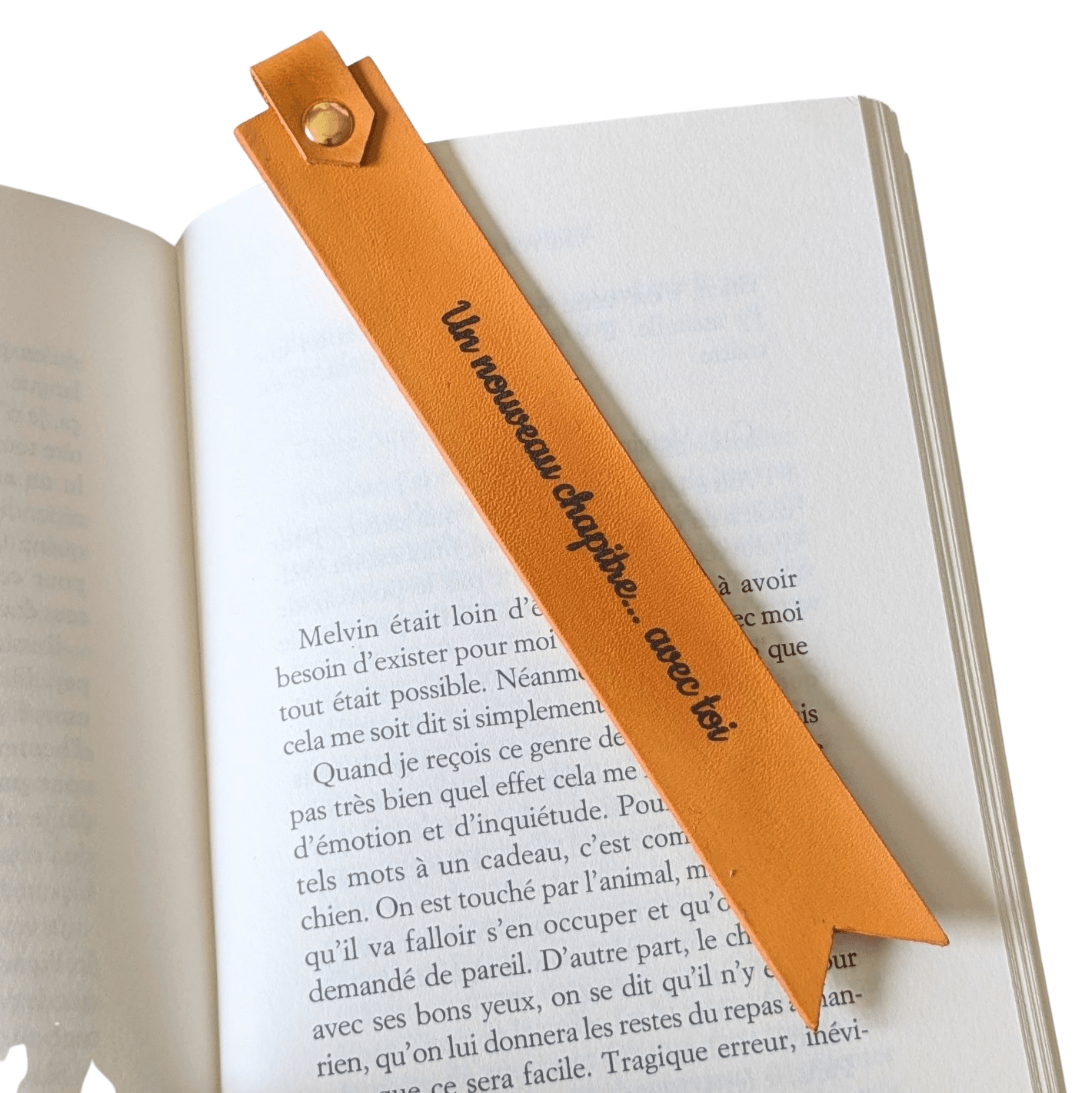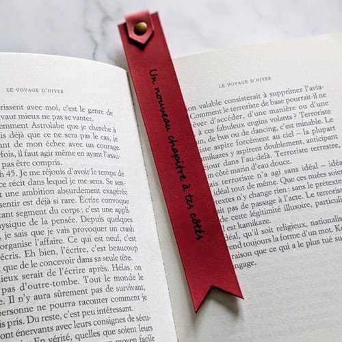 Un marque-page en cuir véritable, fait main en France, personnalisable par gravure laser. Idée cadeau unique pour passionnés de lecture.