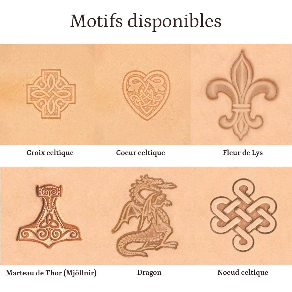 | Motif | Symbole médiéval embossé (noeud celtique, croix celtique, marteau Mjolnir…) teinté à la main. Ton sur ton ou bicolore. |